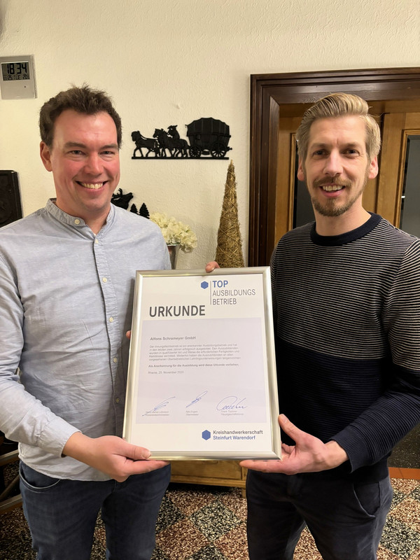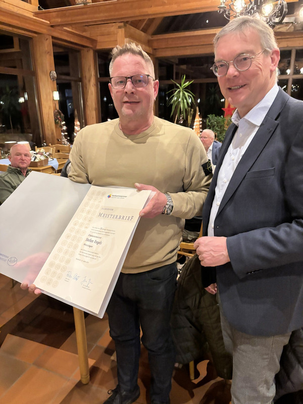 Carsten Schrameyer erhielt aus den Händen des neuen Lehrlingswartes Christoph Tigger die Urkunde "TOP-Ausbidlungsbetrieb" und Stefan Engels bekam von Alfred Engeler den Silbernen Meisterbrief überreicht. Herzlichen Glückwunsch!