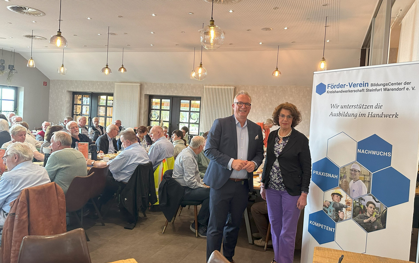 Jedes Jahr bedankt sich die Kreishandwerkerschaft Steinfurt Warendorf mit dem "Ü65-Danke-Nachmittag" bei vielen ehemaligen Ehrenamtsträgern. In diesem Jahr war der Kreis Steinfurt an der Reihe, somit konnten Erika Wahlbrink als Ehrenkreishandwerksmeisterin und Frank Tischner als Hauptgeschäftsführer insg. 70 Teilnehmende in Ibbenbüren begrüßen.