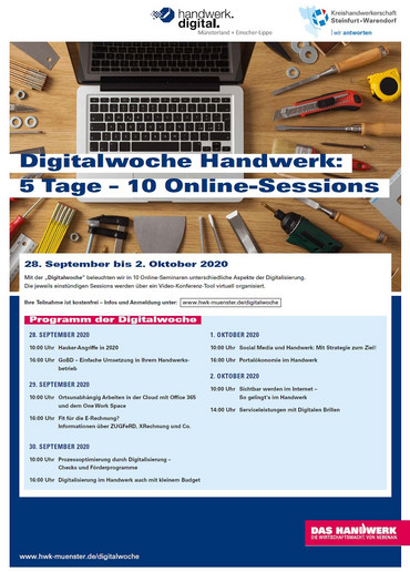 In der Zeit vom 28. September - 2. Oktober 2020 finden unter dem Motto "Digitalwochen 2020" 10 Online-Seminare unterschiedlichster Aspekte der Digitalisierung durch die Handwerkskammer Münster statt. Die jeweils 1-stündigen kostenfreien …